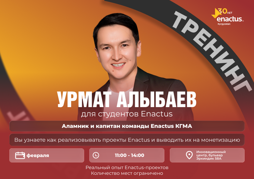 Урмат Алыбаев — аламник и капитан команды Enactus КГМА, а также член Совета директоров Enactus Кыргызстан. Он прошёл путь от студенческого лидерства до участия в стратегическом развитии национального движения Enactus и сегодня делится практическим опытом с командами.